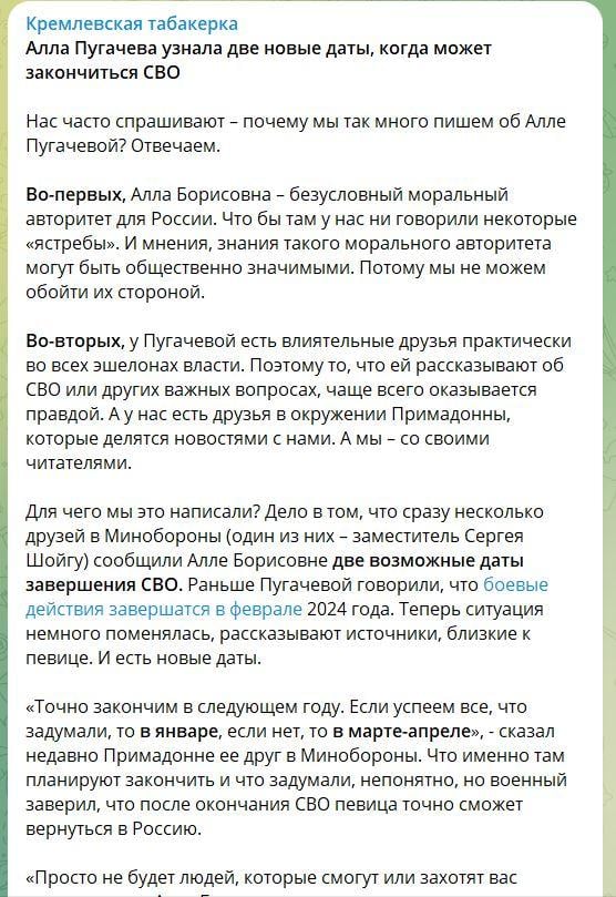 Как говорится в сообщении, сразу несколько друзей в Минобороны один из них – заместитель министра обороны РФ Сергея Шойгу сообщили Алле Борисовне две возможные даты завершения войны. Раньше Пугачевой говорили, что боевые действия завершатся в феврале 2024 года. Теперь ситуация немного поменялась, рассказывают источники, близкие к певице, назвав новые даты.