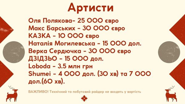 В целом артисты ставят цену в долларах или евро. Однако исключением из такой закономерности стала Светлана Лобода. Цена за выступление достигает трех с половиной миллионов гривен.