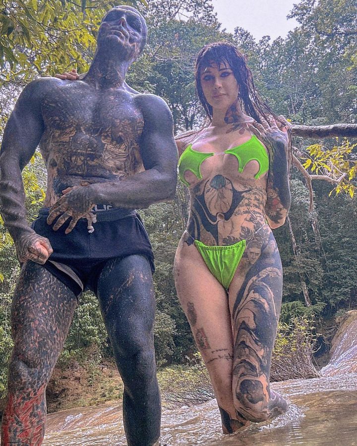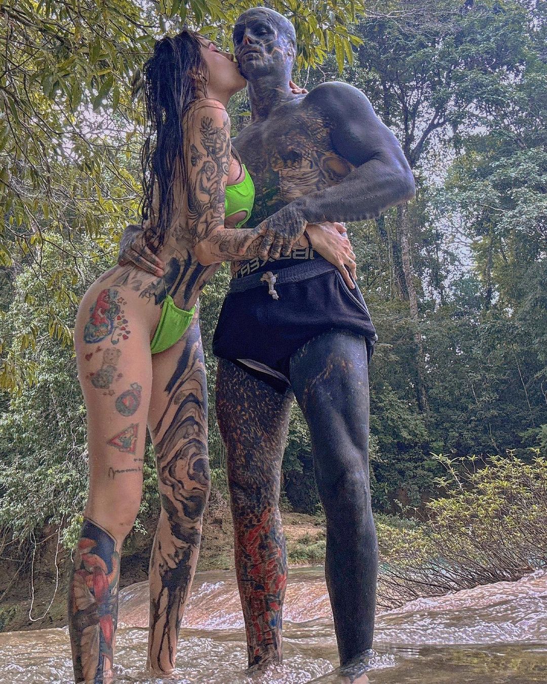 Сразу заметно, что эту пару связывают общие интересы — тело спутницы «инопланетянина», едва прикрытое ярко-зеленым мини-бикини тоже покрыто множеством татуировок.