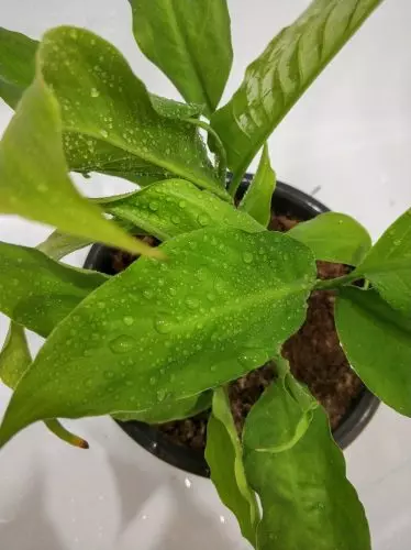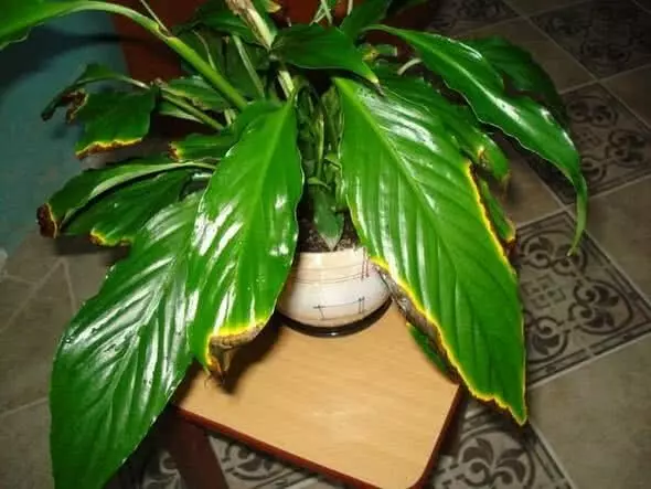 Потемневшие листья — это результат не сухого воздуха в квартире, а гниения корней из-за слишком тяжелого грунта. В тени растение не развивалось, поэтому и воды ему нужно было не много. Начитавшись о том, что «женское счастье» любит влагу, соседка поливала его обильно и регулярно, тем самым только ухудшив ситуацию.