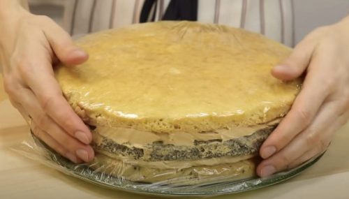 Смажьте два коржа кремом и соберите торт, оставив верхний корж без крема. Поместите торт в холодильник на час.