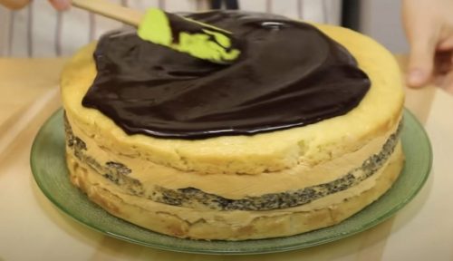 Готовой глазурью полейте верх торта после охлаждения.